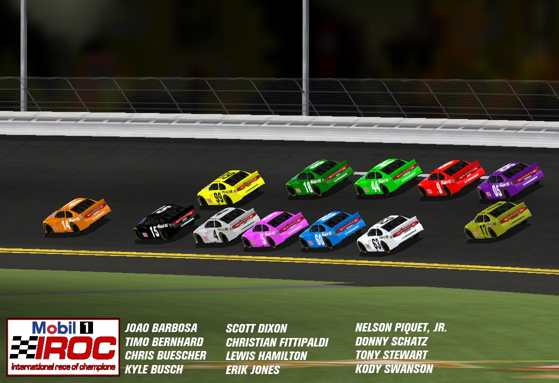 It has been 10 years since IROC had its final season so I decided to make some of my own. This is my custom cars I made about the fictional Mobil 1 IROC series. The 12 drivers in this carset includes drivers from NASCAR, open wheel, dirt and sports cars. Since these are custom cars, I put them in Gen-6 Dodge Chargers since NASCAR don't drive them anymore much like how IROC previously drove Pontiacs when NASCAR no longer used them. Credit: IROC logo (Rubbin's Racin'), Mobil 1 logo (Magpie Oil change), Gen6 Template (BullRing Motorsports), screenshot (myself)
